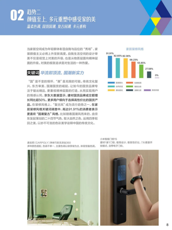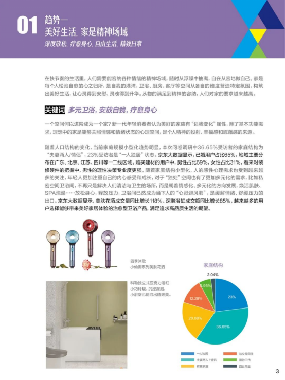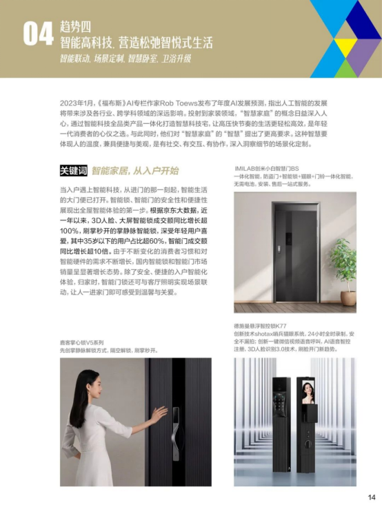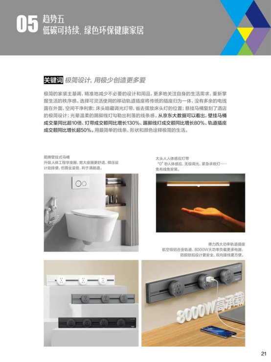 通过智能科技全品类产物享受聪慧糊口,无醛地板成交单量同比增加超60%,家拆消费趋向也更加精细化、多元化。智能浴室柜成交单量同比增加100%。越来越多的消费者正正在注释极简糊口。近三分之一消费者会优先考量带有“绿色”特征的产物。阶梯式水槽成交额同比增加超85%,调研成果显示,跟着我国生齿布局的变化和糊口体例的演变,从京东数据能够看出,